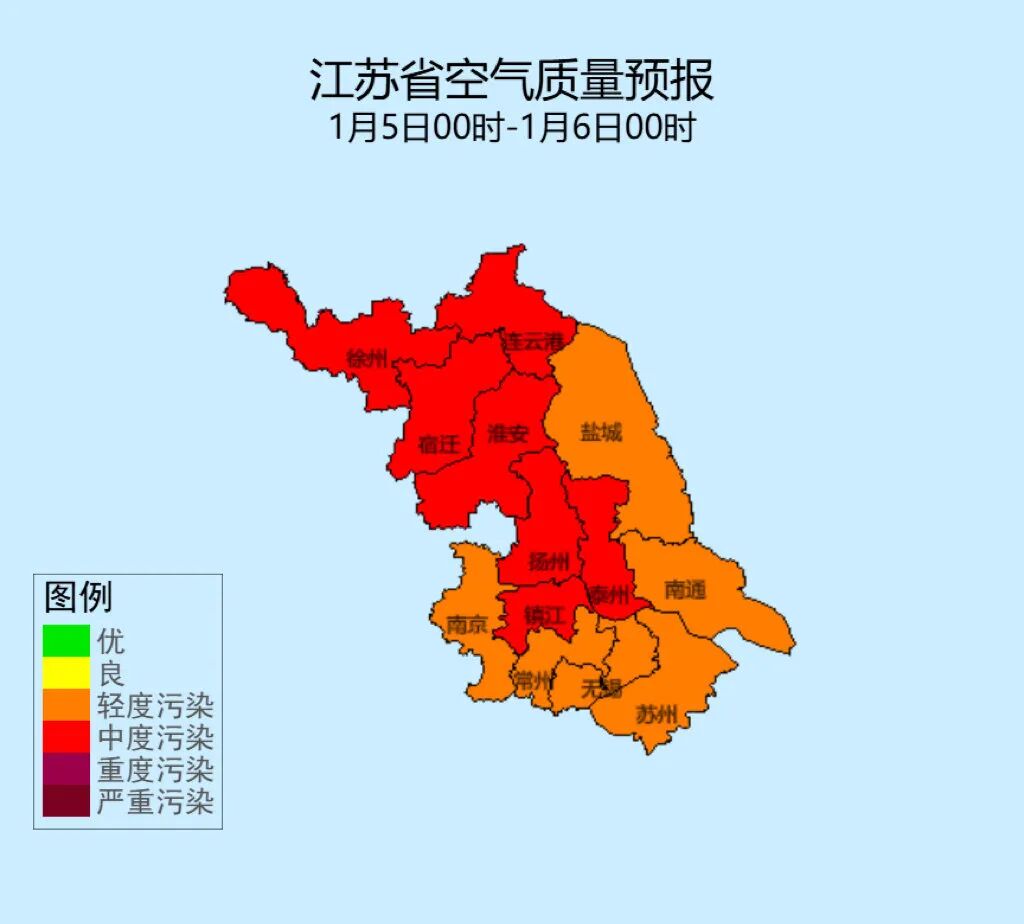 交汇点讯 根据江苏气象预报,5—6日全省空气质量以轻度—中度污染为主,7日全省空气质量以良-轻度污染为主。记者留意到,针对此次预报,江苏多地已将重污染天气黄色预警升级至橙色预警,并提醒学校和幼儿园减少或停止户外活动。