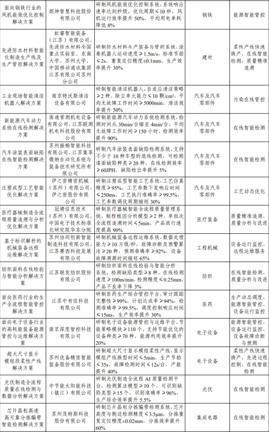 名单显示,共73个项目入选,其中,朗坤智慧科技股份有限公司的“面向钢铁行业的风机能效优化控制解决方案”等14个江苏项目在列,入选项目数最多,标志着这些企业在智能制造领域的创新成果取得国家级认可,服务的重点行业包括钢铁、建材、汽车及汽车零部件、医疗装备、工程机械、纺织、医药、电子设备、光伏、集成电器等,均为江苏的重点和优势产业。