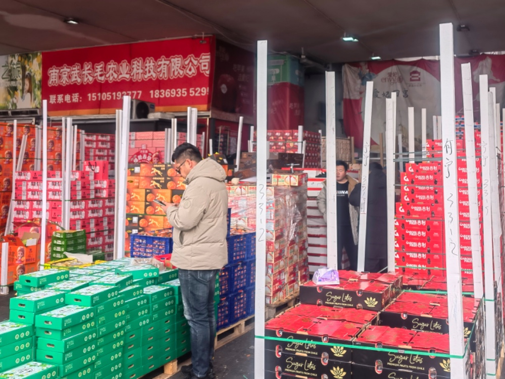 1月6日,在南京农副物流中心(南京众彩)水果A区,南京武长毛农业科技有限公司负责人何宁正忙着接听零售商的配货电话。