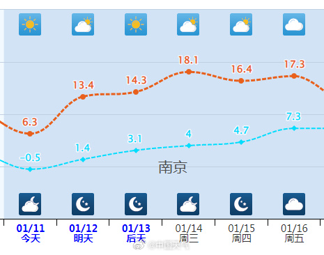 1月13日20时至1月14日20时,全省多云到晴。最高温度:淮北北部地区14~15℃,苏南地区19~20℃,其他地区17℃左右;最低温度:本省东南部地区3~4℃,淮北地区0℃左右,其他地区2℃左右。全省偏南风4级左右。