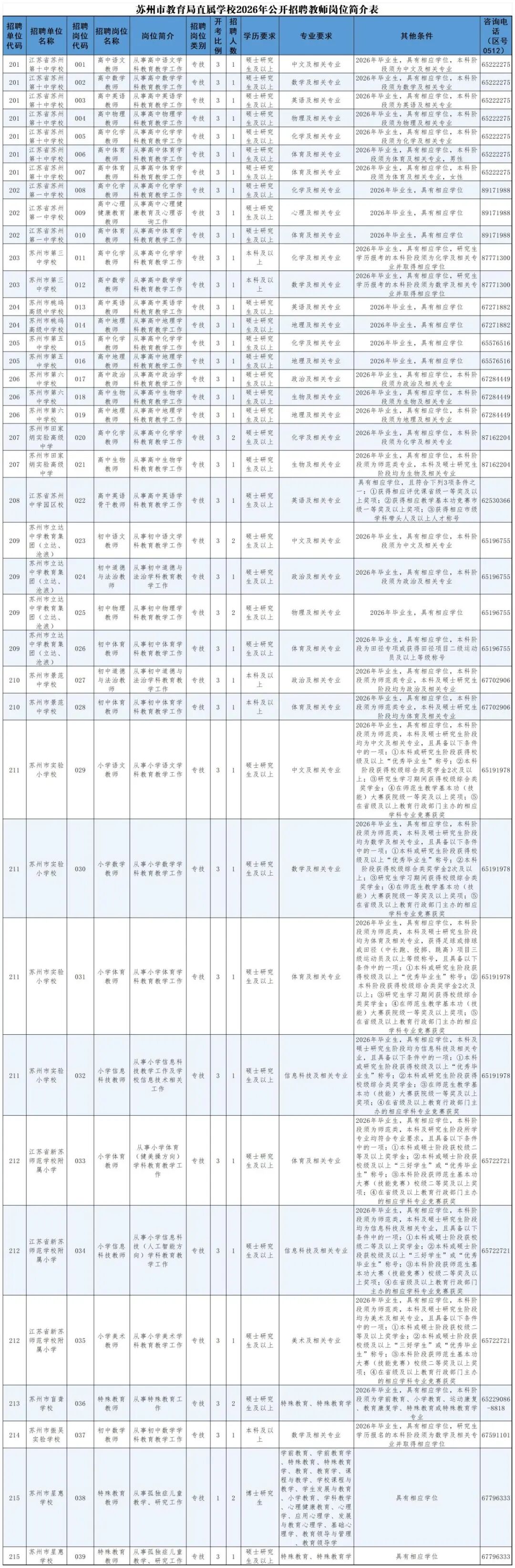 苏州市教育局直属学校2026年面向社会公开招聘教师44名(公办学校事业编制)。招聘岗位及条件等可在苏州市教育局网站(http://jyj.suzhou.gov.cn)、苏州市人力资源和社会保障局网站(http://hrss.suzhou.gov.cn)上查询。