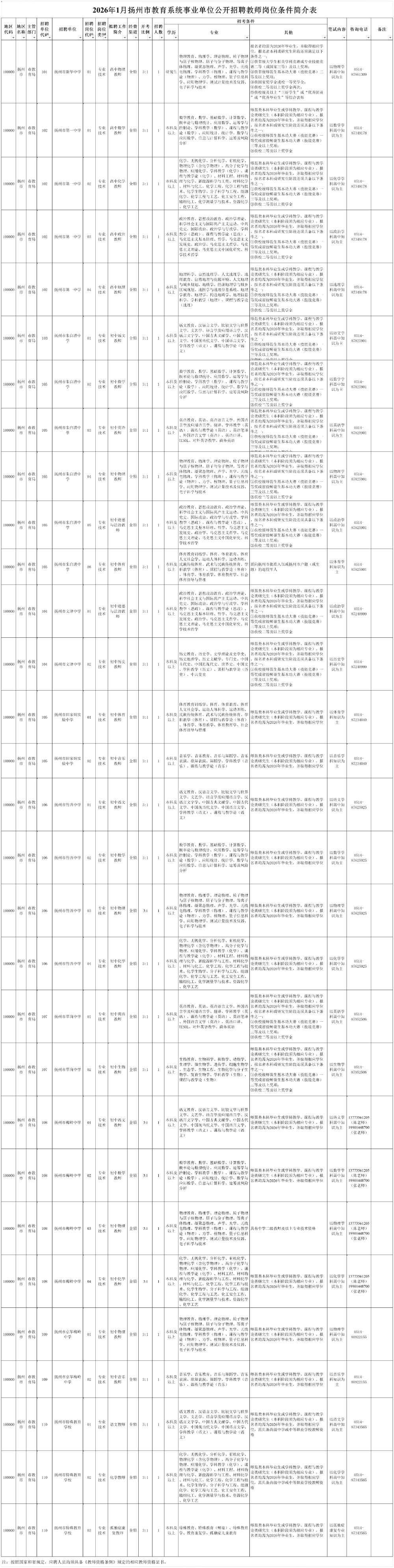 可直接登录扬州市教育局网站(http://jyj.yangzhou.gov.cn/)查询《2026年1月扬州市教育系统事业单位公开招聘教师岗位条件简介表》,也可登录扬州市人力资源和社会保障局网站(hrss.yangzhou.gov.cn)查询。