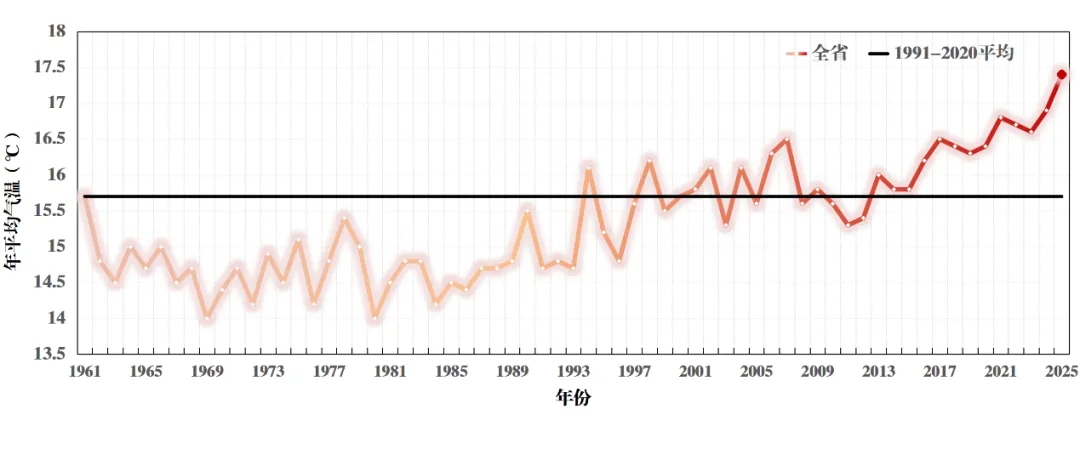 2025年,江苏省年平均气温达17.4℃,较常年偏高1.7℃,不仅打破了2024年16.9℃的纪录,再次创下1961年以来历史新高,更实现连续第13个气温偏高年,全省所有国家站年平均气温均突破本站历史最高纪录,暖热特征极为突出。与暖热相伴的是降水偏少,全省平均降水量1011.4毫米,较2024年偏少22.3%,较常年偏少4.9%,且降水分布不均,呈现“面弱点强”的态势。