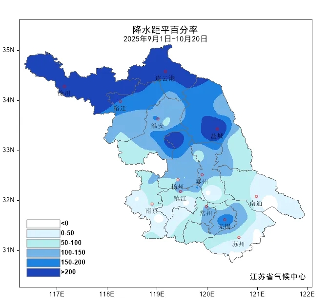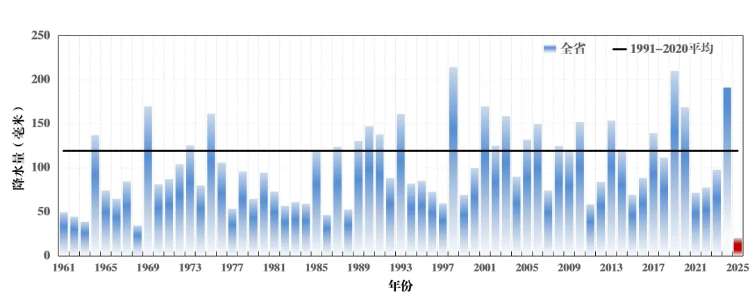 极端天气事件在全年各时段均有显现,其中2024年12月至2025年2月的冬季降水量仅20.5毫米,仅为常年冬季的17%,成为1961年以来历史同期最少,全省74%的国家站冬季降水量打破建站以来历史最少纪录,由此引发的冬春连旱影响严重。2024年12月至2025年4月全省降水量较常年偏少66%,同样为历史同期最少,春季气象干旱最为严重,全省43%的国家站达重旱以上等级并持续40余天,卫星监测显示石臼湖、高邮湖面积较上年同期分别减小29.7%和17.8%,淮北地区农业用水紧张,冬小麦受旱明显,后期依靠人工增雨作业和自然降水才得以缓解。