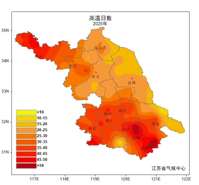 高温天气在2025年表现得尤为“顽固”,全省平均高温日数达31天,较常年的11天偏多近2倍,与2024年并列历史第三,全年共出现7次区域性高温过程。值得关注的是,8月12日至31日遭遇有记录以来最晚的大范围持续强高温,10月6日仍有27个站点出现35℃~36℃的高温,刷新最晚高温日纪录,昆山、吴江等9站高温日数突破历史极值,西连岛、滨海等6站日最高气温也创下历史新高。高温的持久存在也让2025年夏季成为“超长待机”的一年,全省平均入夏时间为5月21日,刷新历史最早纪录,入秋时间则推迟至10月9日,为有气象记录以来第二晚,夏季时长达到141天,跻身1961年以来历史第一长。