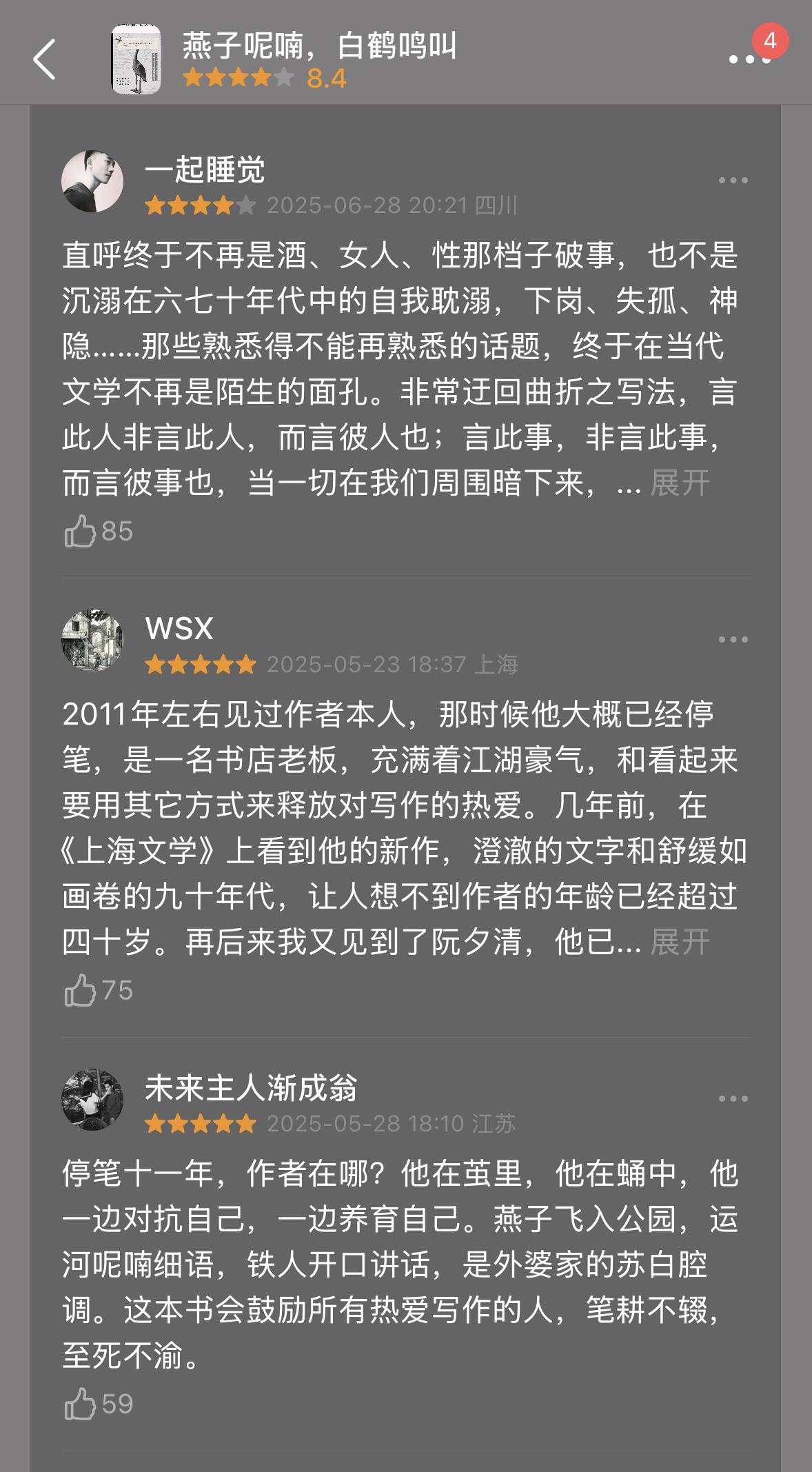 豆瓣上,上千名读者为《燕子呢喃,白鹤鸣叫》打出8.4的高分,500多名读者写下短评,使该书成为豆瓣读书榜单2025年度中国文学(小说类)top1。作品入选搜狐文化年度榜单,入围新世相出版奖,头部播客“文化有限”解读该书的节目吸引7.7万听友收听。从这位70后的小说中,读者读出了那个失意迷茫的“老己”,也触摸到作品微温的内核。