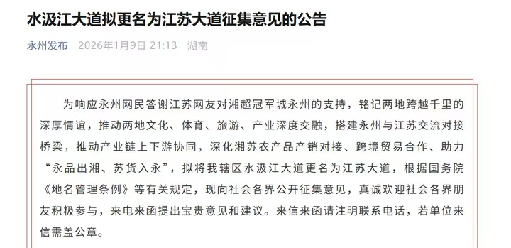 更令人瞩目的是,1月9日,永州市冷水滩区自然资源局发布公告,拟将水汲江大道更名为“江苏大道”,以此铭记江苏网友对永州的支持。这条全长4公里、连接国际陆港与主城的主干道,如今已成为新的“网红打卡地”。1月10日晚,扩建后“江苏大道”的第一盏路灯点亮,据悉也是由一位苏州网友赞助。未来,沿路绿化带将融入江苏十三市文化特色,这条路也将成为承载情谊的永久地标。