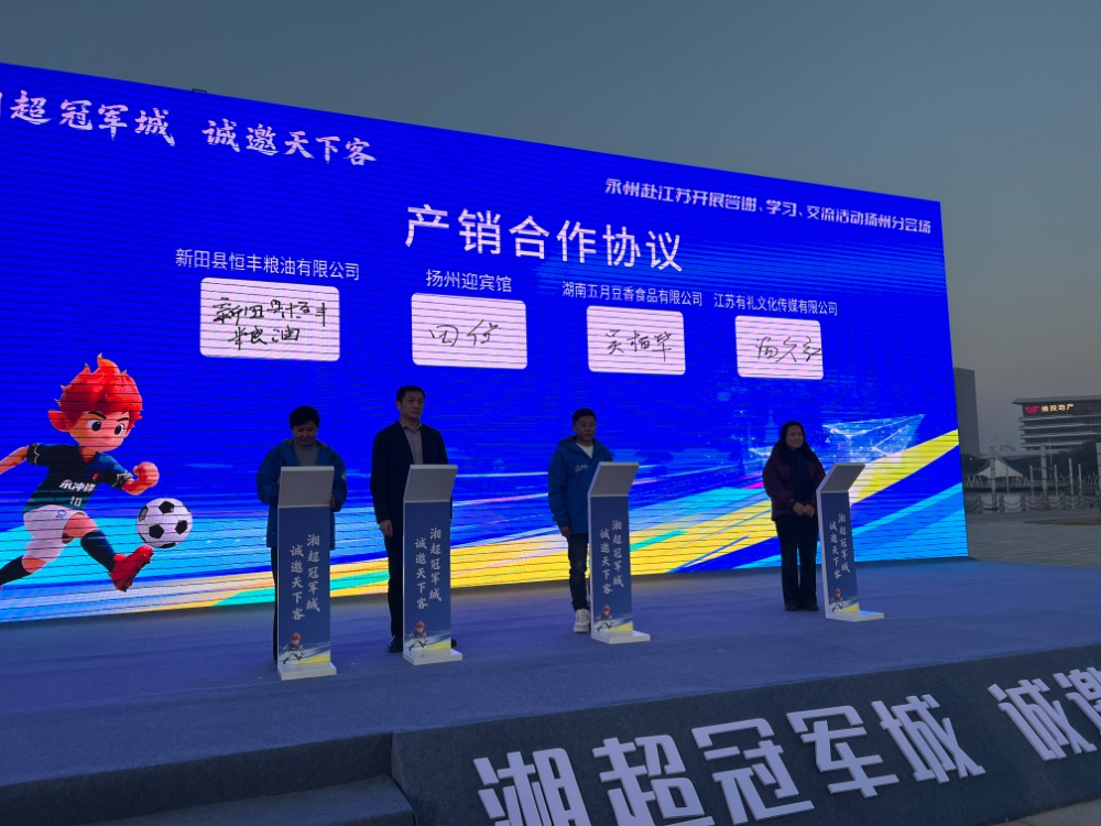 这场盛会的缘起,是一段温暖人心的城际佳话。2025年,平均年龄19.8岁的永州足球队在湘超联赛中逆袭夺冠,励志的表现感动了无数网友,江苏人民自发跨省为永州各县区投放祝福广告牌。为了答谢这份深情厚谊,深化文化、旅游、产业等多领域合作,“永冲锋”永州代表团满载诚意而来,将网络上的暖心互动转化为线下的深度交流。