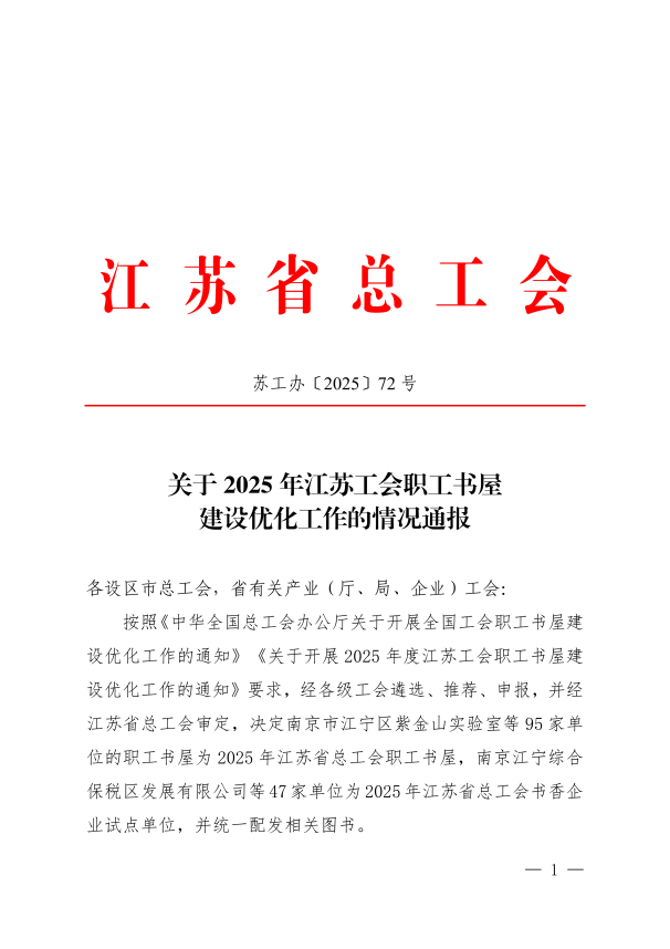近日,江苏省总工会发布《关于2025年江苏工会职工书屋建设优化工作的情况通报》,建邺高新区2家企业获评“2025年江苏省总工会职工书屋”,2家企业获评“2025年度江苏省总工会书香企业试点单位”。