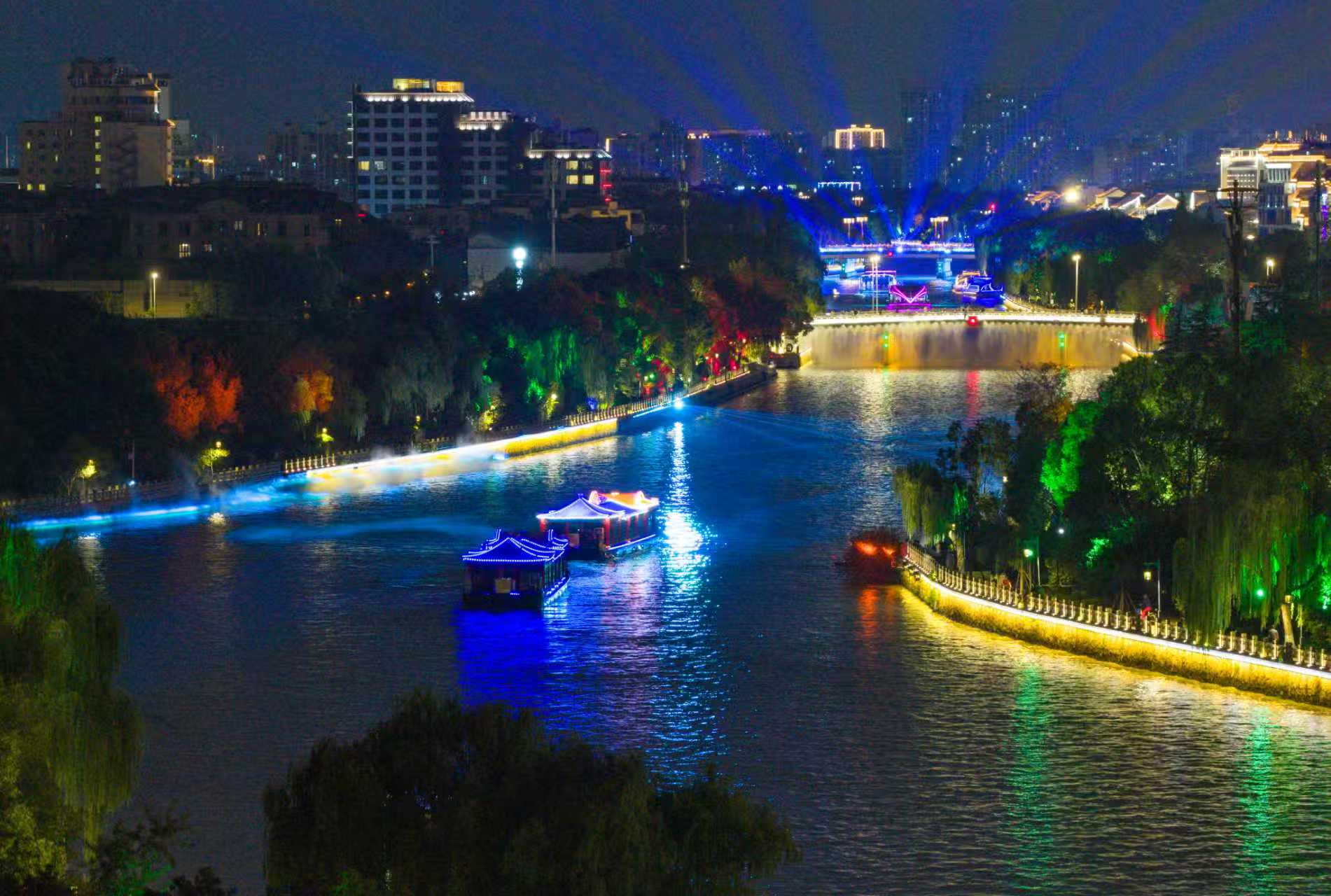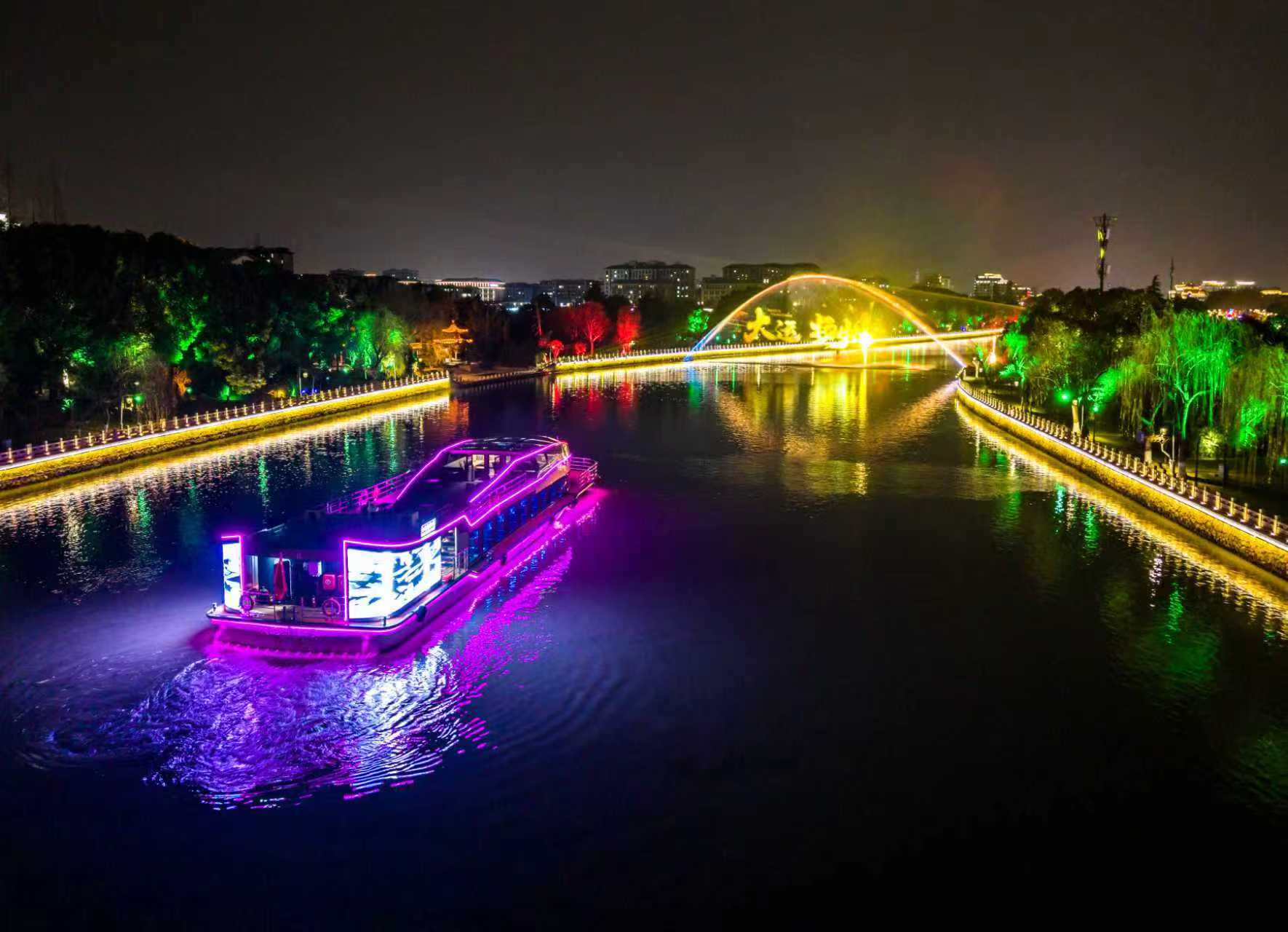 船行至徐凝门桥,全息水幕中浮现出漕运船只往来穿梭的画面,运河水面仿佛泛起千年波澜。项目总导演王公冠介绍,作为全国首创的“行进式游船+岸线光影科技+实景演艺”三位一体项目,“大运扬州”彻底颠覆传统观光模式。定制游船的舒适座椅、清晰音效系统为体验保驾护航;运河两岸,升级后的滨河亮化景观与全息水幕、三维动画、特效装置无缝衔接,5G+北斗技术让声、光、电、水、火实现一键联动,每一秒都有新的视觉惊喜。