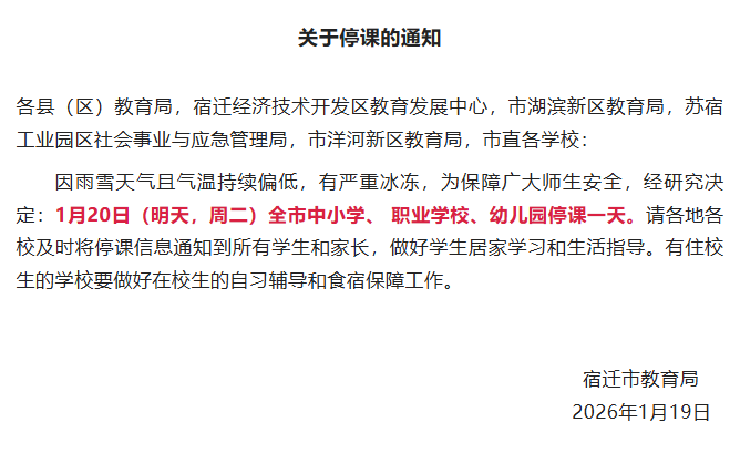 根据宿迁市教育局的通知,此次停课是因雨雪天气且气温持续偏低,有严重冰冻,经研究后作出的保障性决定。通知要求各县(区)教育局及市直各学校及时将停课信息传达给所有学生和家长,并做好学生居家学习和生活指导。对于有住校生的学校,则需妥善安排在校生的自习辅导和食宿保障工作。