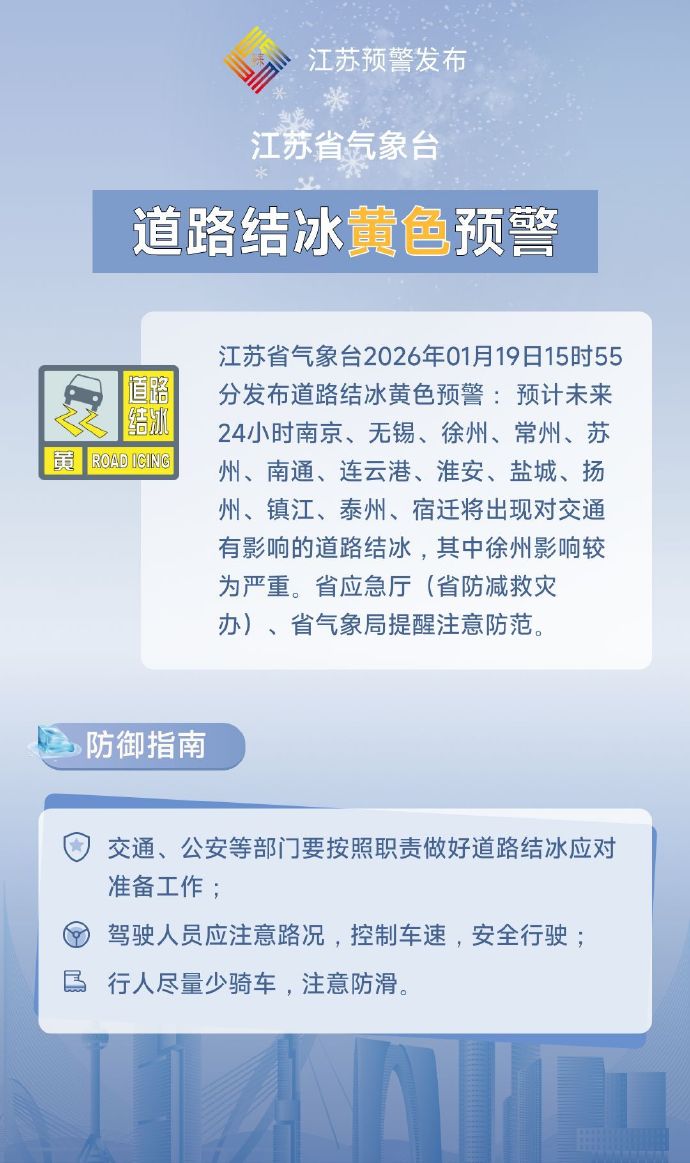 江苏省气象台2026年1月19日15时55分已发布道路结冰黄色预警,预计未来24小时,南京、无锡、徐州、常州、苏州、南通、连云港、淮安、盐城、扬州、镇江、泰州、宿迁全域将出现对交通有影响的道路结冰,其中徐州受影响较为严重。此外,今日全省陆上阵风达7~8级,江河湖库、沿海海区阵风8~9级,大风天气将进一步加剧寒意。