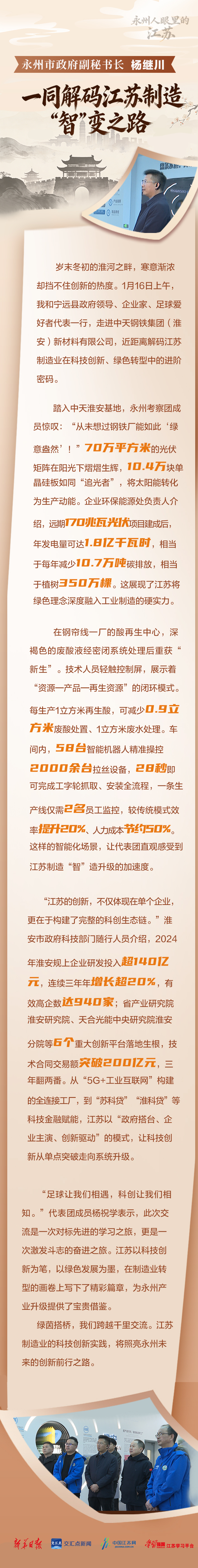 江苏、永州,因“苏超”“湘超”结缘。1月14日—16日,永州一行来江苏学习交流。即日起,新华日报·交汇点新闻推出专栏《永州人眼里的江苏》,以永州人视角,深入呈现江苏在经济建设、文化传承、科技创新、生态保护等多方面的卓越成就,为深化两地交流合作提供全新观察维度与思考路径。