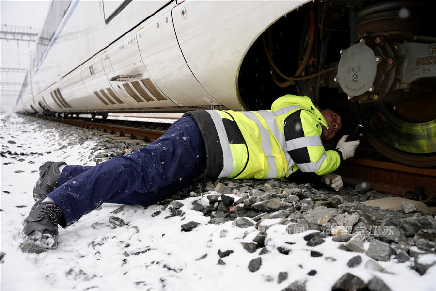 1月19日,南京动车段徐州东所青年机械师以雪为令,全天候对存车场停放、备用动车组以及站场进行巡视,全力保障动车组运行安全。徐玉恒 摄 视觉江苏网供图