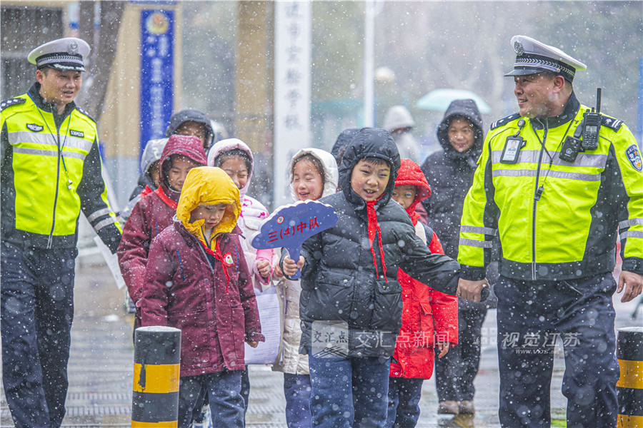 1月19日,宿迁市宿城区河滨街道一学校门口,交警在雪中护送学生安全过马路。徐江海 摄 视觉江苏网供图