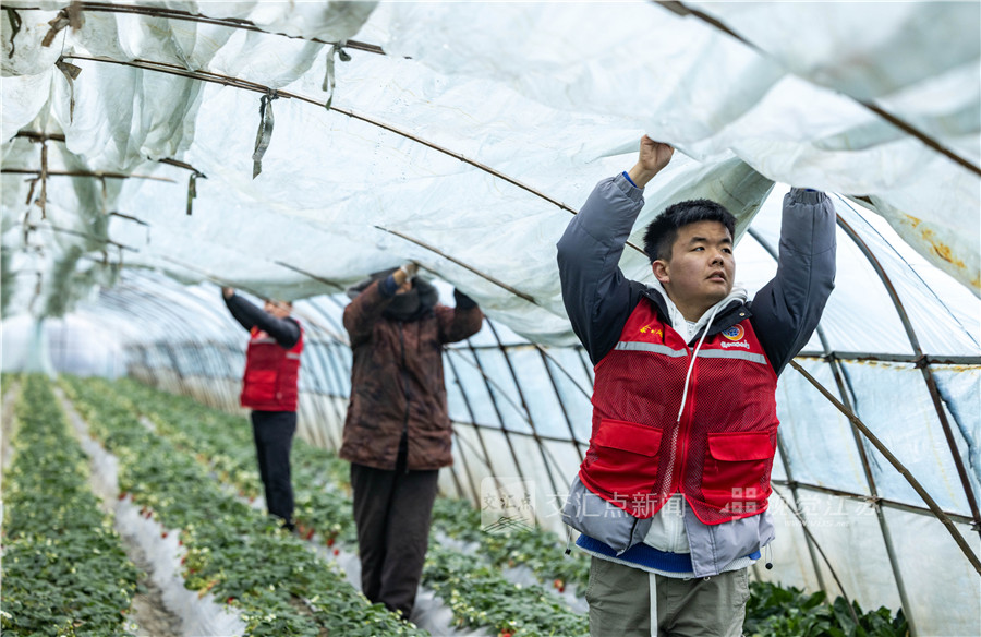 1月19日,国网泰州供电公司“小水滴”志愿服务队青年志愿者帮助种植户覆膜对果蔬大棚进行保温。汤德宏 摄 视觉江苏网供图