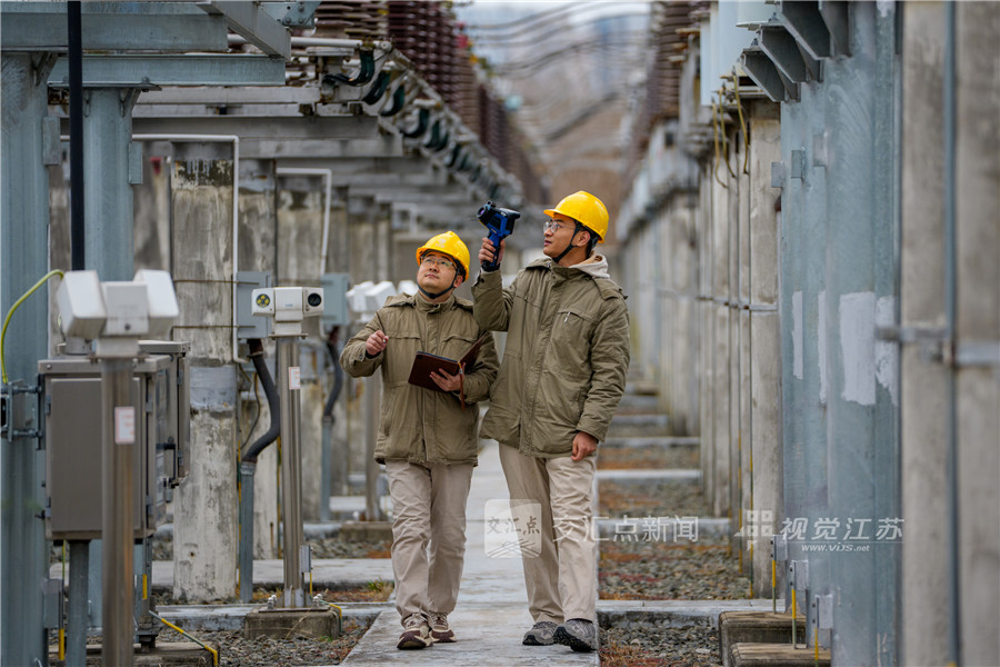 1月19日,国网南京供电公司变电运维人员在220千伏殷巷变开展测温巡视工作,确保电网设备安全运行。杜懿 摄 视觉江苏网供图