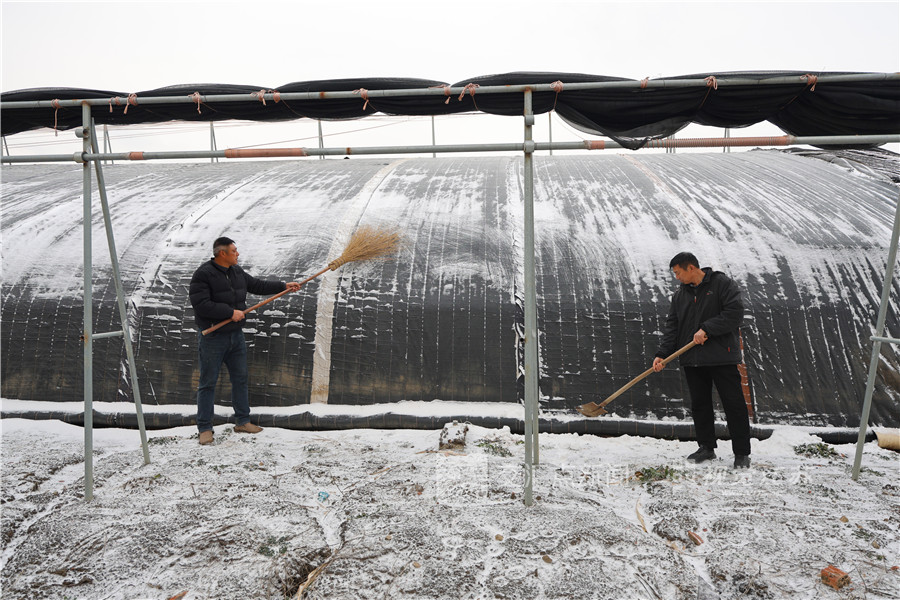 1月19日,连云港市海州区的江苏农垦岗埠农场,工作人员及时清除棚外积雪,确保寒潮降雪天气大棚作物正常生长。徐卫 窦双双 摄 视觉江苏网供图