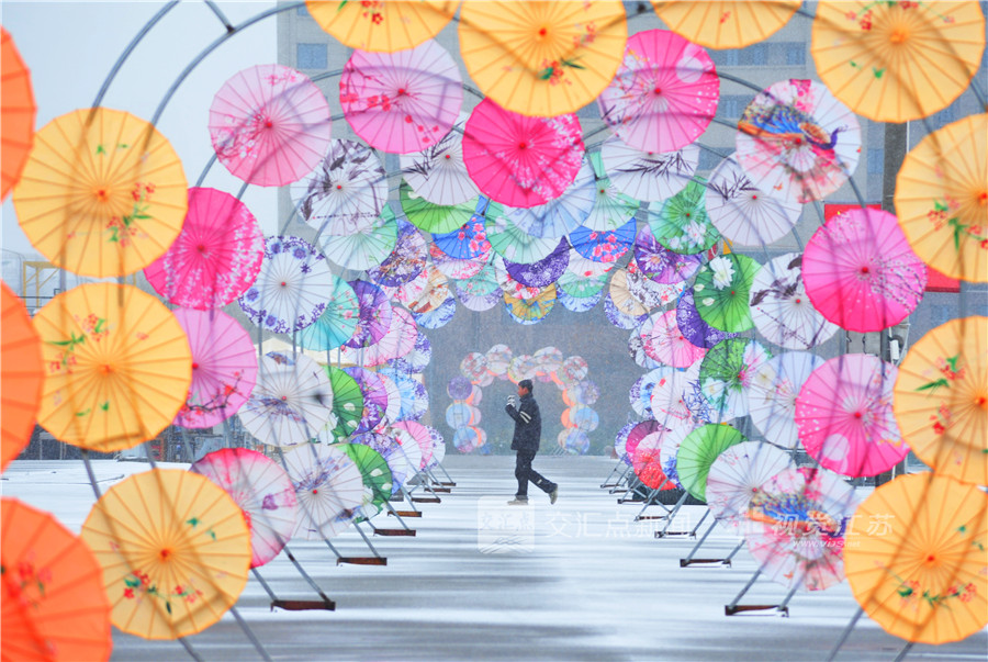 1月19日,徐州市睢宁县城区迎来降雪,一位市民从由油纸伞搭成的拱形长廊通过。洪星 摄 视觉江苏网供图