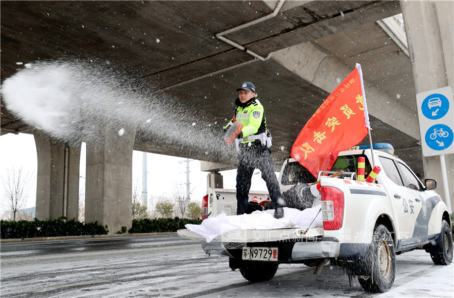 1月19日,宿迁市公安局交通管理支队一大队民警冒雪为群众出行保驾护航。王力 摄 视觉江苏网供图