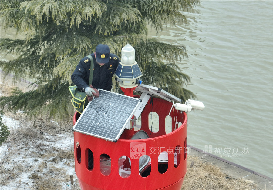 1月19日,淮安航务中心淮安航道管理站组织人员顶着风雪对辖区航道辅助设施除雪检查维护,确保航道安全畅通。张德春 摄 视觉江苏网供图