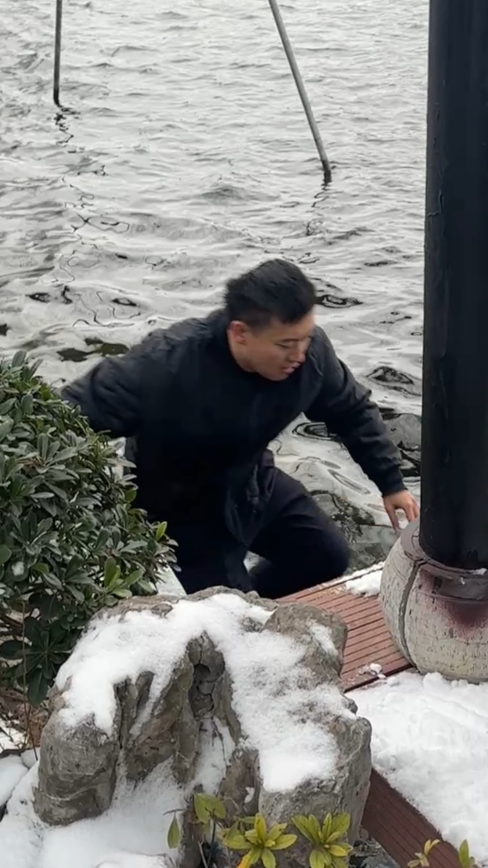 当天,南京市迎来了2026年的第一场雪,最低气温骤降至-5℃。下午四时许,南京警方接到市民报警称,建邺区某湖边一位老人不慎落水。警情就是命令!接警后,民警陈玉潇、闫松岳火速前往救援,3分钟就到达现场。经过紧张搜寻,最终在湖边栈桥的正下方发现了被困水中的老人。栈桥下空间狭窄且距离岸边较远,竹竿够不着,救生圈也扔不进去。此时老人在水中瑟瑟发抖、脸色惨白。