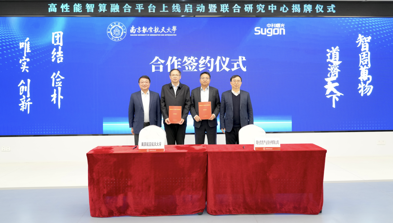交汇点讯 1月20日,中科曙光与南京航空航天大学合作签约暨超智融合创新应用研究中心揭牌仪式在南航圆满举行。此次合作标志着华东地区首个高校落地的千万级国产超智融合校级算力平台正式启动上线,开启“国产算力+三航特色”校企协同创新新实践,为航空航天领域科技自立自强注入算力动能。
