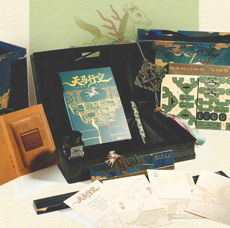 其中,最新推出的“营造法式·天马行空”系列礼盒成为本次展览核心亮点。该礼盒创意根植于南图馆藏国宝《营造法式》,将斗拱的精密结构与纹样的几何韵律,巧妙转化为拼插风铃、定制钢笔、尺子套装等现代单品。