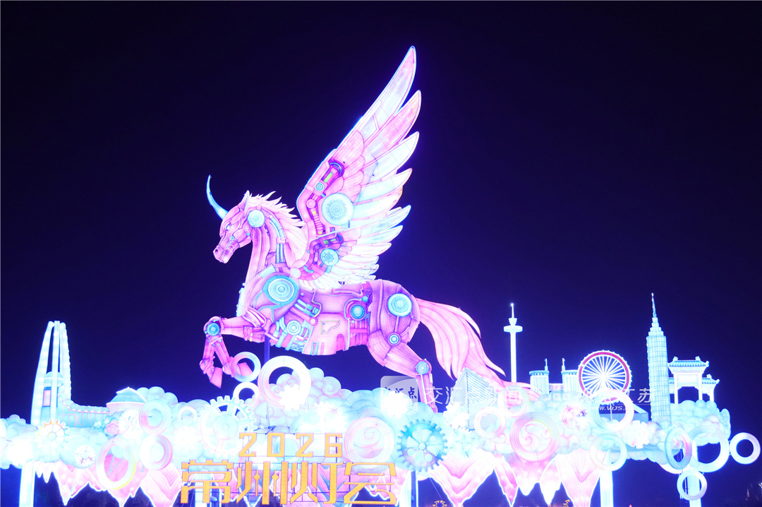 1月16日,2026常州灯会现场,悬浮灯组“天马行空”充满机械美学和科技感,吸引众多游客参观。该悬浮灯组宽35米、高25米,是华东地区首个。王启明 摄 视觉江苏网供图