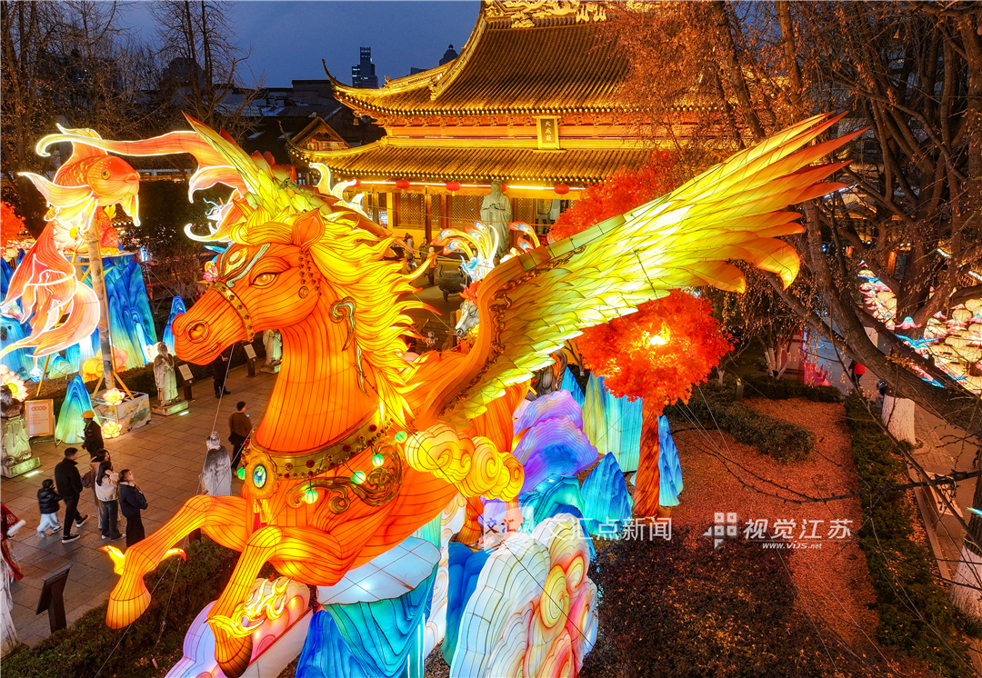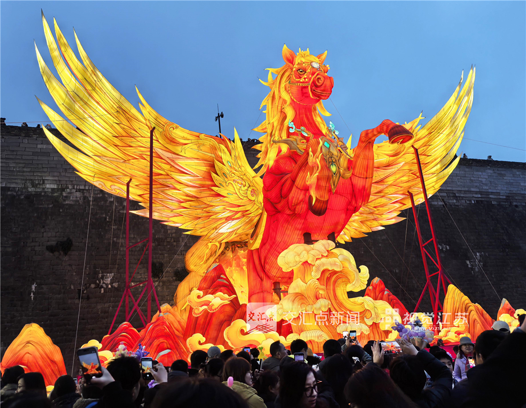 1月17日晚,南京老门东明城墙下,巨型“飞马灯”璀璨亮灯,将年味拉满,吸引众多市民、游客前来观赏。新华日报·交汇点记者 宋宁 摄