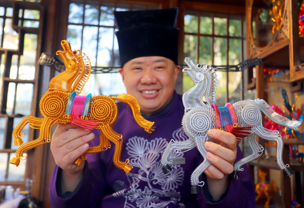 1月9日,民间艺人蒋大江在苏州虎丘民间工艺亭内用金属丝等材料手工制作的生肖马栩栩如生,吸引了人们的目光。王建康 摄 视觉江苏网供图