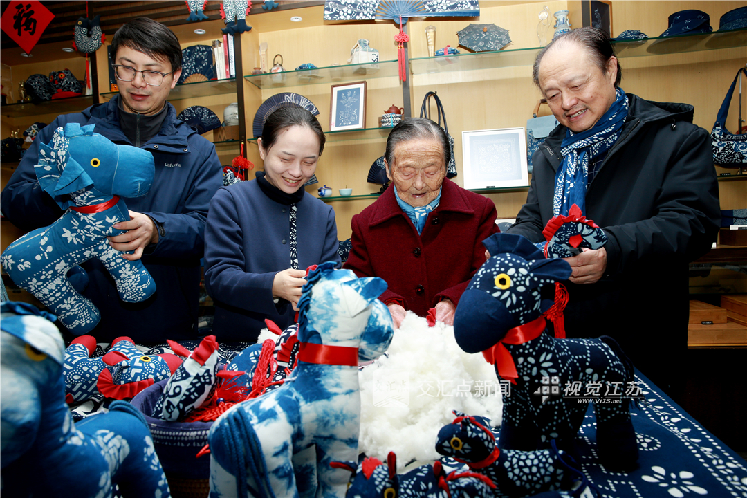 1月14日,99岁高龄的国家级非遗蓝印花布传承人管惠芳,与孙女吴灵姝、女婿倪沈键一起赶制“生肖马”布偶。它们款式各异、时尚可爱,蓝白交织的色彩洋溢着浓郁的年味与艺术气息,成为人们传递祝福的文化载体。宋诚林 摄 视觉江苏网供图