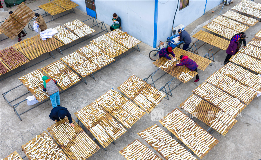 1月17日,在兴化市千垛镇荡朱村,村民在晾晒刚刚制作好的年糕。春节临近,兴化市大大小小的年糕加工作坊热闹起来,加紧制作年糕,街头巷尾飘着年糕香。周社根 摄 视觉江苏网供图