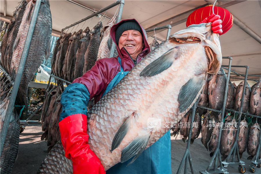 1月21日,南京市固城湖螃蟹市场化身“腊味江湖”,成排的咸鱼咸肉沐浴暖阳,微风中咸香四溢。新华日报·交汇点记者 邵丹 摄