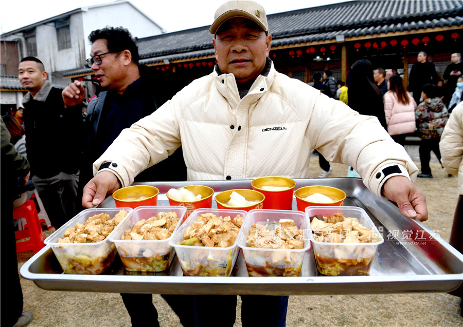 1月18日,南京市浦口区永宁街道侯冲社区举办“我在北岸过大年”活动,吃一顿“杀猪宴”流水席,抓鸭围攻赛、看非遗展演,市民和游人感受着乡村浓烈的年味。新华日报·交汇点记者 吴俊 摄