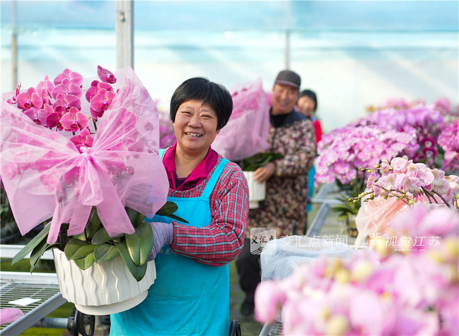 1月23日,春节临近,在泰州市姜堰区顾高镇现代园艺产业园基地,花卉工人忙着给蝴蝶兰造型组盆、装运,确保春节期间花卉市场供应。周社根 摄 视觉江苏网供图