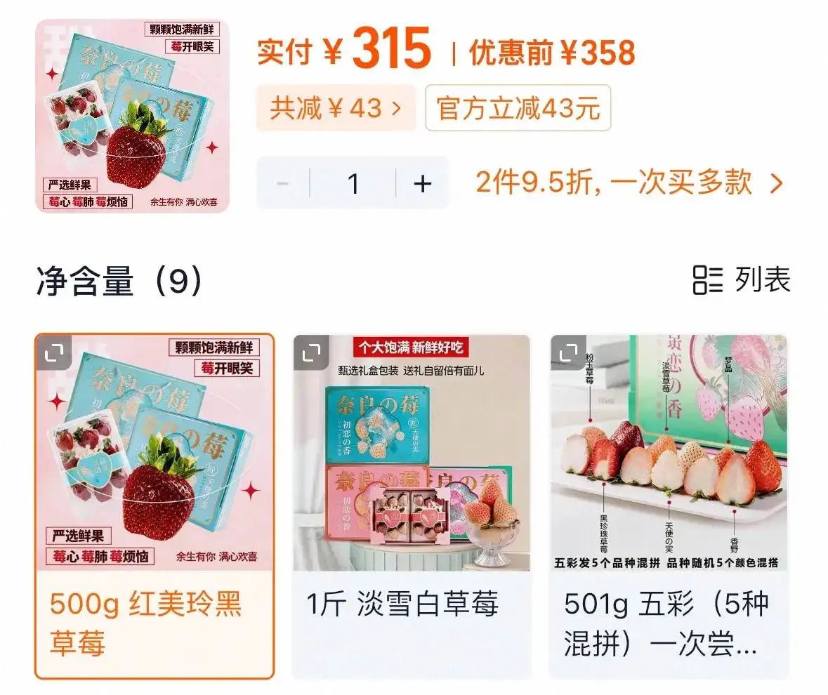 值得注意的是,黑草莓目前市场价格参差不齐,波动也大,终端售价差异悬殊。一方面是因为产品上市初期,供给量少及链路成本高导致价格较高;另一方面在整体供需关系上,黑草莓仍属于“稀缺品种”,销售渠道对商品的定位差异影响最终价格,例如普通市场与高端购物中心的售卖价格存在一定差异。