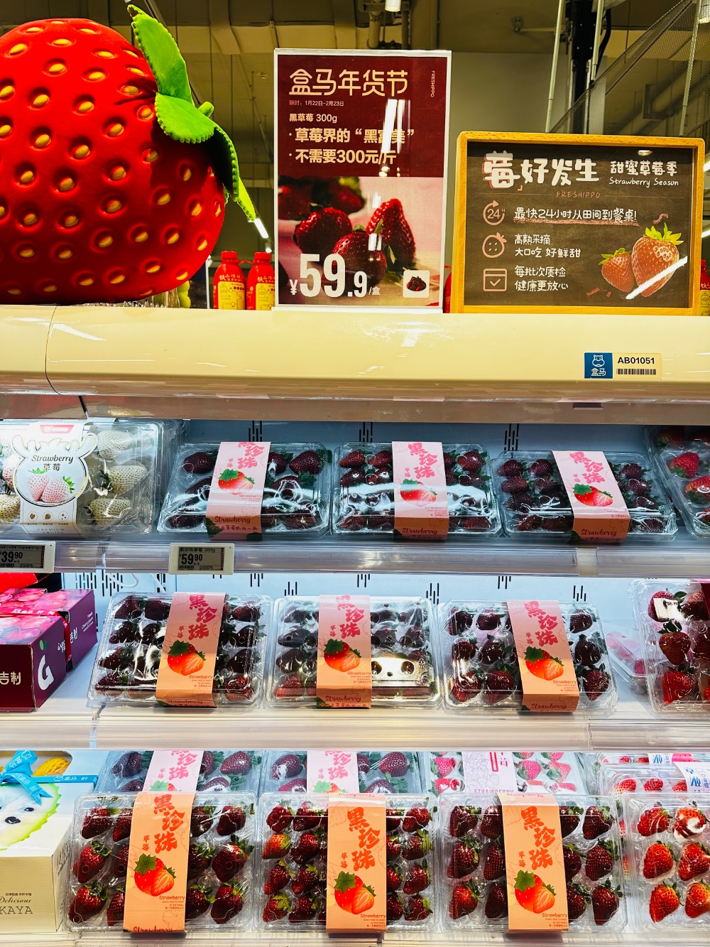 走访线下时,记者在盒马南京门店看到,一盒盒黑珍珠草莓放在冷藏柜,价格为59.9元/300克,换算成斤,价格接近100元。销售人员表示,该草莓产自江苏南通,因为产量少,所以价格比普通红颜草莓高了不少。盒马App数据显示,本月已有超1000人购买,且基本一上货很快就被抢光。