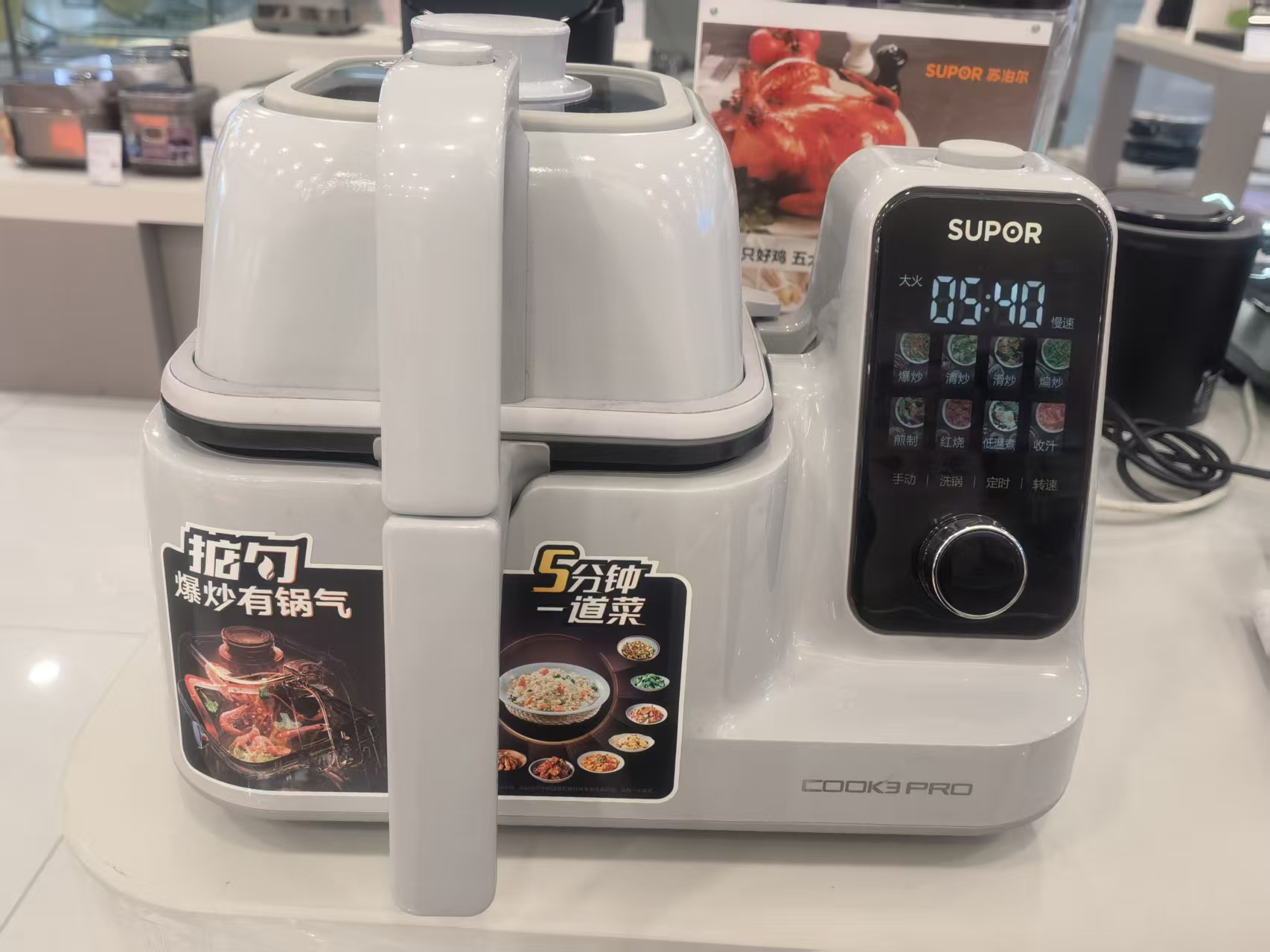 “销量还不错,年轻人、老年人,还有部分房车爱好者是主要购买群体。”导购员高兆花指着样机介绍,对年轻人来说,切好食材,倒入锅中,就能坐等美食出锅;老年人看中的是“自动颠勺”设计,比较省力;房车自驾游群体觉得炒菜机器人比电磁炉方便,特别是它的智能控温技术将油温限制在250℃以下,油烟减少80%以上,让做饭不再“满身油烟味”。