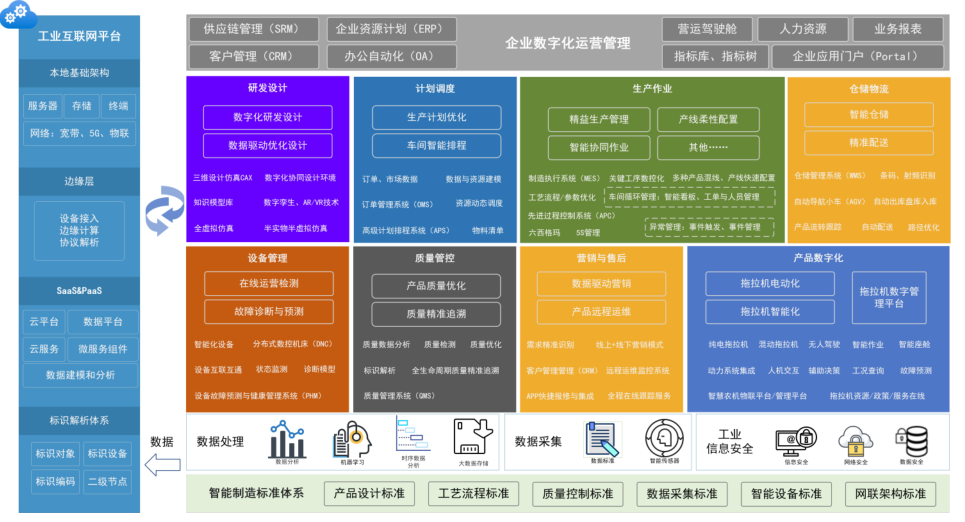 拖拉机研发设计与生产制造过程复杂,依赖完善技术标准体系的支撑与保障,国内拖拉机行业标准主要集中于整机及其零部件产品,拖拉机智能化改造、数字化转型、网络化联接的相关标准则仍在建立和完善阶段。同时,不同产业链位置、不同规模企业,在推进实施智能化改造、数字化转型、网络化联接的重点环节、典型场景、解决方案时存在一定差异。
