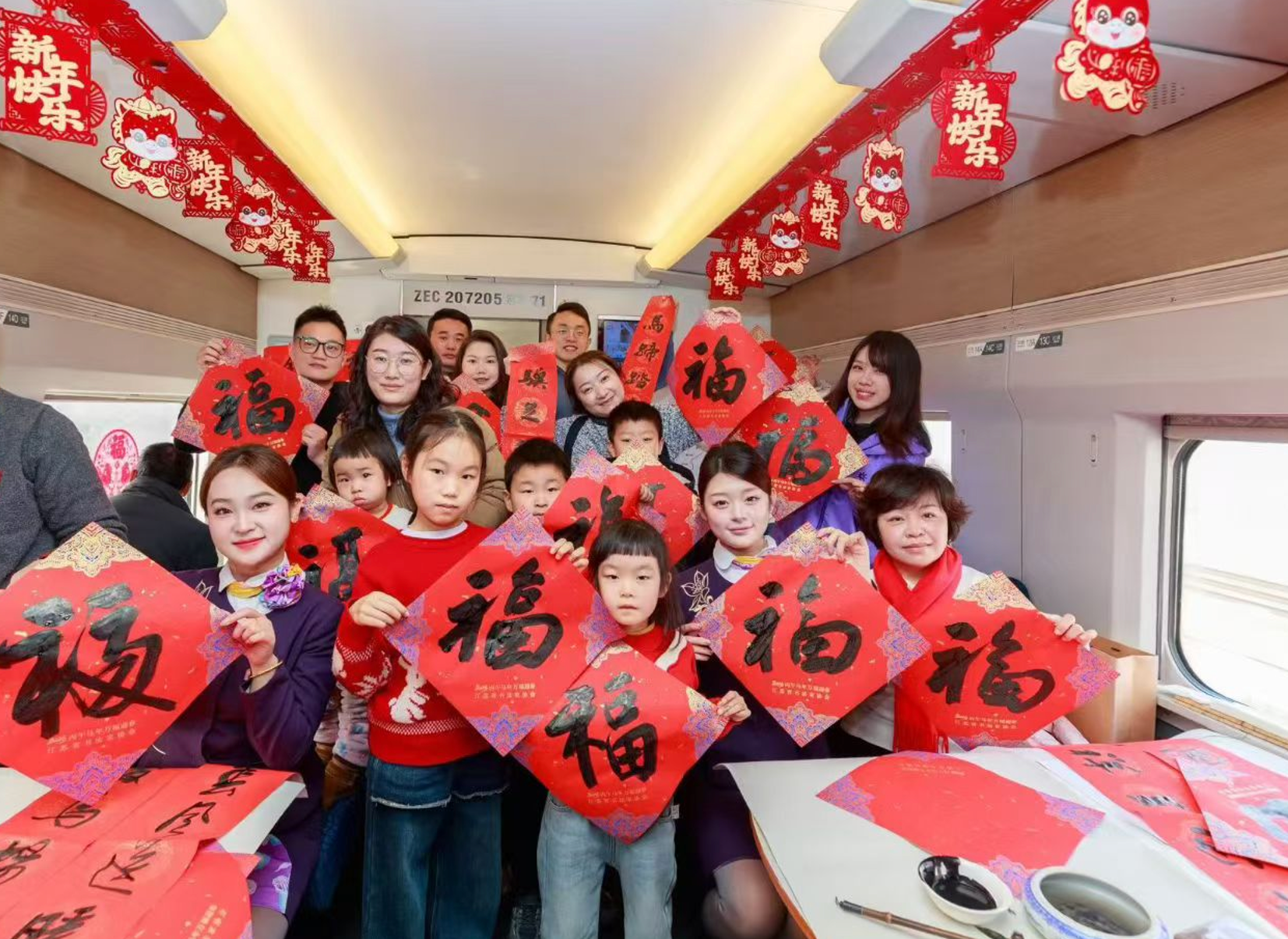 春运启动前一天,长三角“超级环线”高铁G8388次列车于10时27分准时驶出上海站,当天近20名“三省一市”书法名家登车挥毫,为旅客书写春联与“福”字,南京客运段列车乘务员在列车上粘贴窗花、悬挂彩带,营造浓厚新春氛围,为旅客送上马年主题小礼品,传递美好新春祝福。同日上午,在江苏南京,一场名为“福至运来,情满旅途”送万福进万家活动在南京南站候车室里火热开展,100余名书法家现场笔走龙蛇,把一副副春联、“福”字送到旅客手中,候车室洋溢着欢乐喜庆氛围。与此同时,千余名书法家深入江苏省各大铁路车站开展新春送福活动。