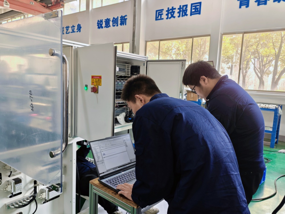 交汇点讯 “这批年前要发往越南的设备,最后几道检测一定得盯紧了!”“电气控制柜的导轨安装马上收尾,客户明天就来验收!”2月5日,年关将近,江苏力旷智能科技有限公司的车间里依旧机器轰鸣、人影忙碌。打包好的货箱整齐堆放着,准备发往国内外;一群身穿工装的年轻人穿梭在设备之间,调试机器、核对图纸、整理线路……他们不是厂里的老师傅,而是南京信息职业技术学院智能制造学院的学生。这个寒假,他们暂别家乡的团圆,一头扎进生产一线,在赶订单、学技术中度过了一个不一样的“实习年”。