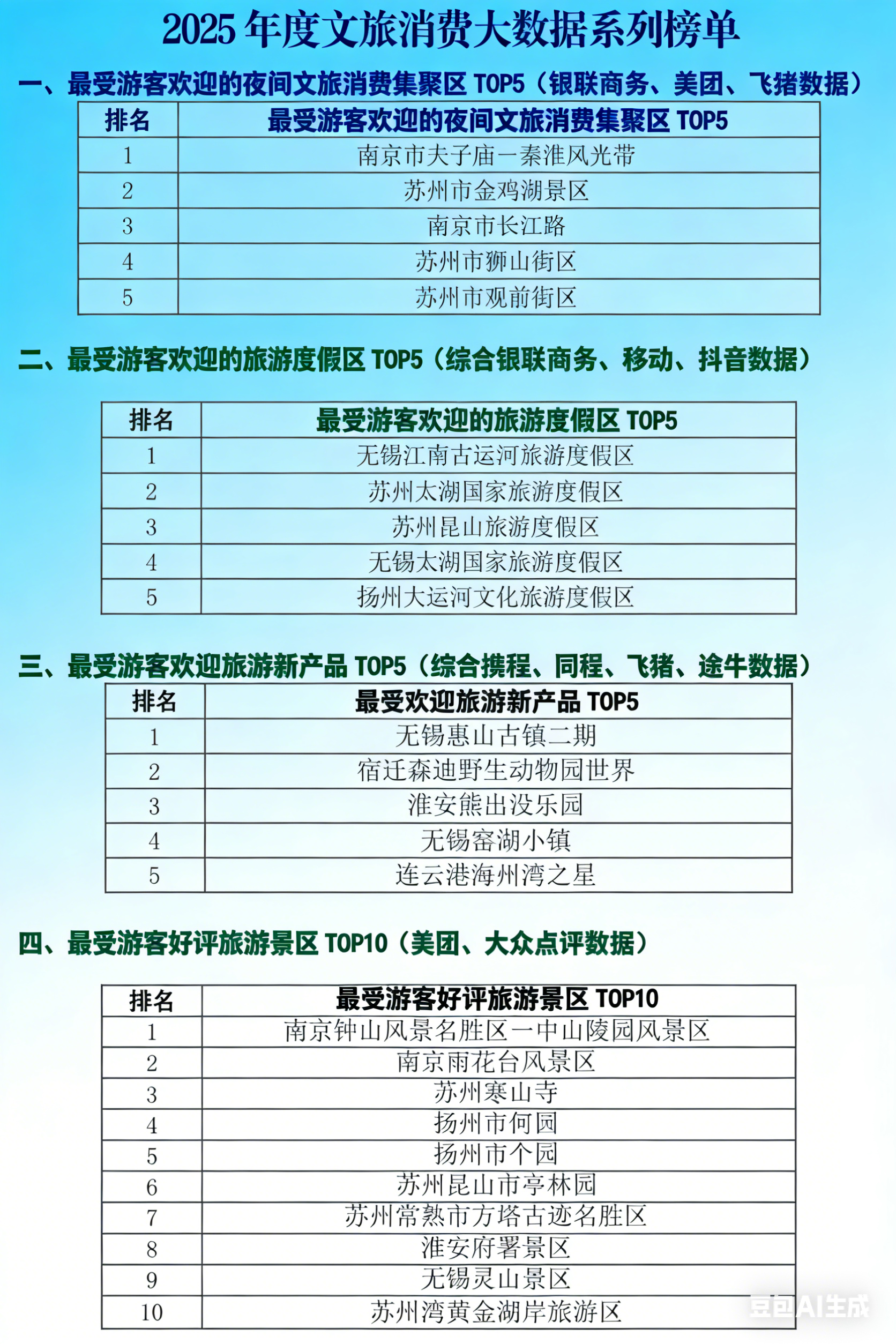 综合银联商务、移动、抖音数据,无锡江南古运河旅游度假区、苏州太湖国家旅游度假区、苏州昆山旅游度假区、无锡太湖国家旅游度假区、扬州大运河文化旅游度假区入选“最受游客欢迎的旅游度假区TOP5”;