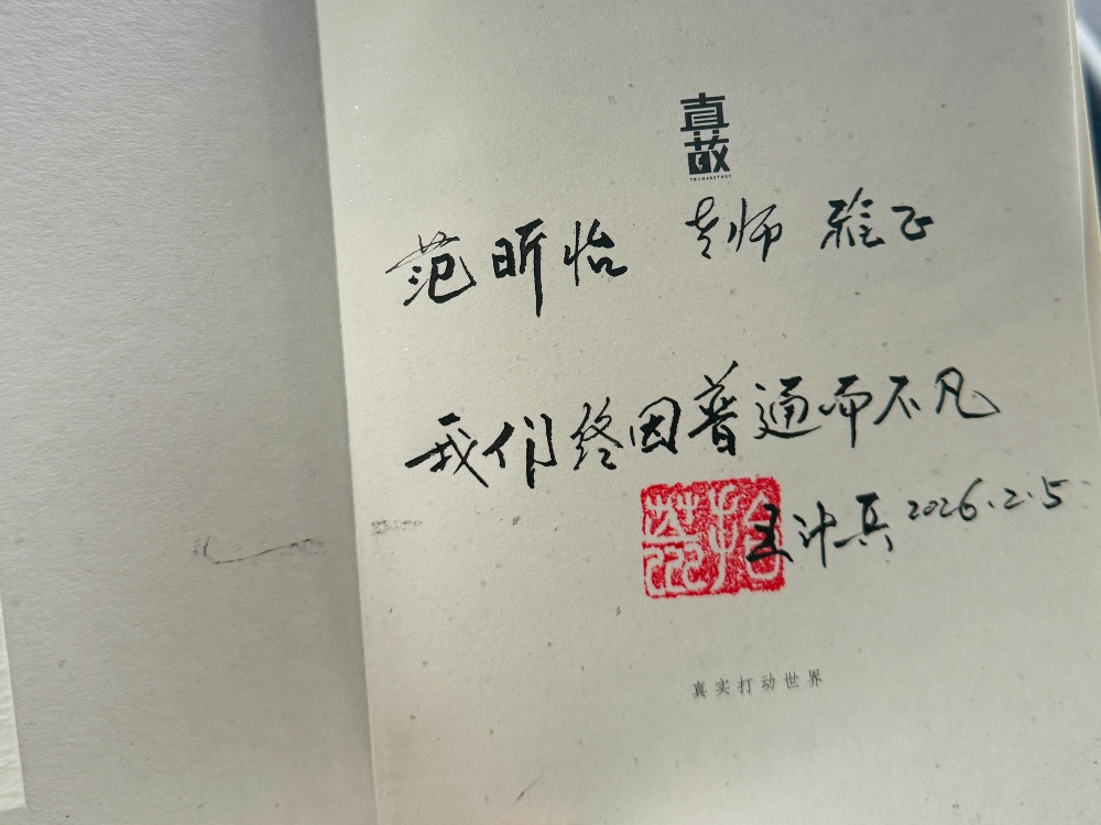 话音还萦绕耳畔时,王计兵忽然转头,从身后的书架上拿了一本《成珍》递给记者,语气里满是真诚:“正好送你一本新书。”“那请你签个名可以吗?”他欣然应允,眉眼里皆是笑意。只见他捧着书,走到收银台前,弯腰俯身,写下了工整的两行字:“范昕怡老师,雅正,我们终因普通而不凡。”