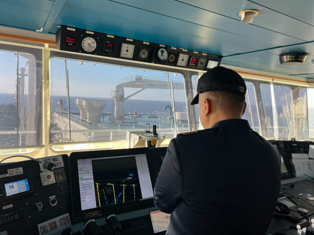 向上攀爬5层楼高,来到“阿尔卡拉缇娅”号轮驾驶台,吴康明、高建康与船长迅速核对船舶的主机功率、吃水深度等信息。“引航就像每天换着开别人的车,油门、刹车等基础性能必须先摸个底。”吴康明面对船只表单上复杂的信息介绍道,他今天的引航任务是将这艘大船侧面停靠至码头,相当于用轮船完成一次“侧方停车”,是引航任务中最有难度的一项工作。只有第一时间摸清这艘船的“脾气”,才能保证大船以合适的速度靠入泊位,避免船只冲击力过大损坏码头设施。
