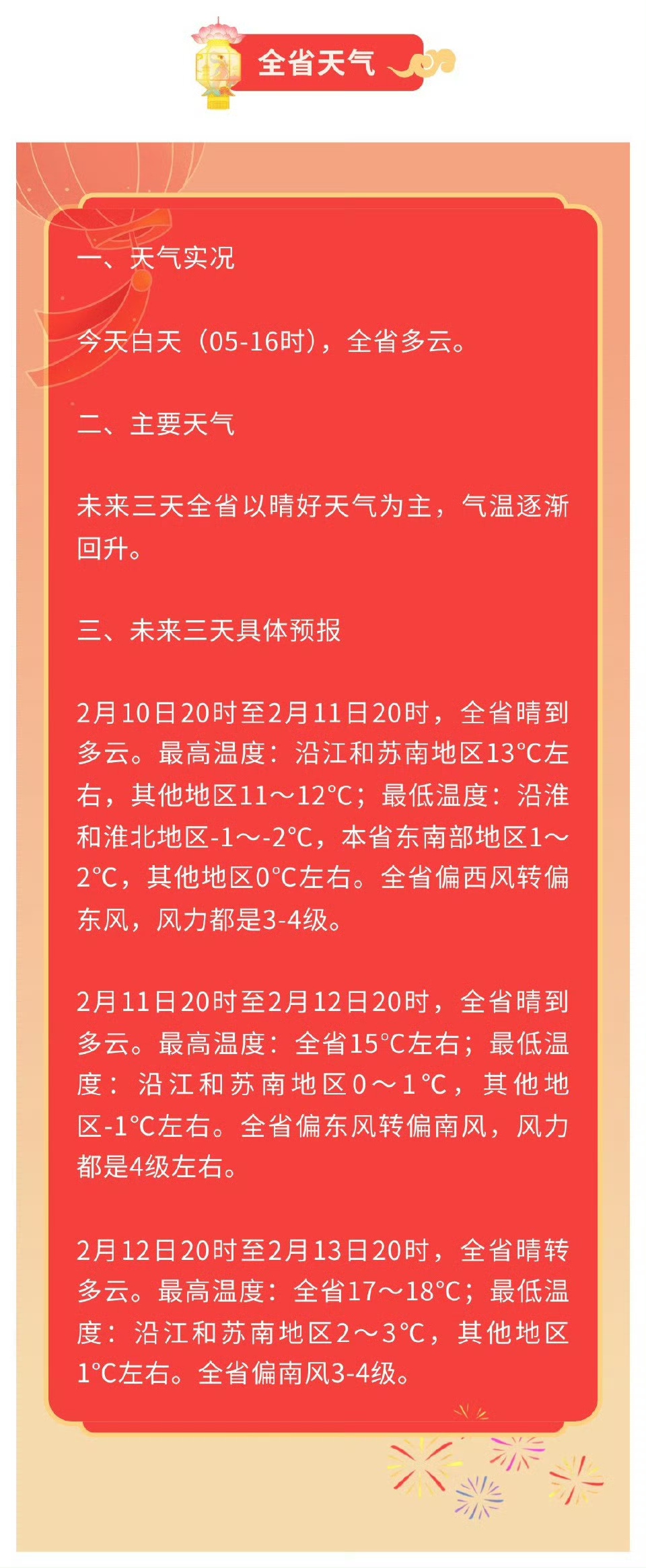 2月12日20时至2月13日20时,全省晴转多云。最高温度:全省17~18℃;最低温度:沿江和苏南地区2~3℃,其他地区1℃左右。全省偏南风3~4级。
