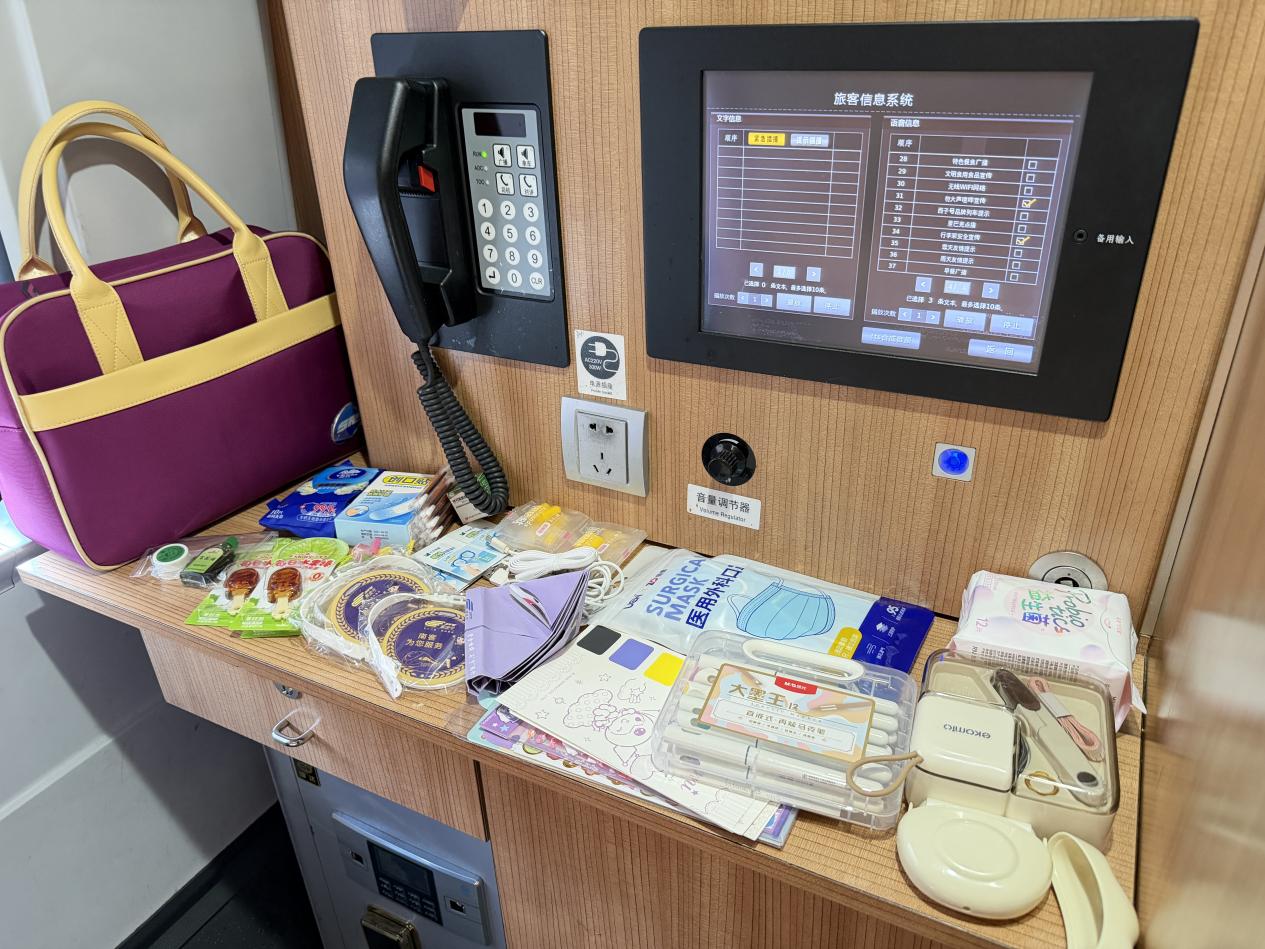 “糖果是给低血糖的旅客,风油精给晕车的旅客,这些卡通贴纸‘奖励’给不哭的小朋友……”杨慧霞如数家珍。所有这些,都整齐地放在工作间的那个紫色乘务包里。