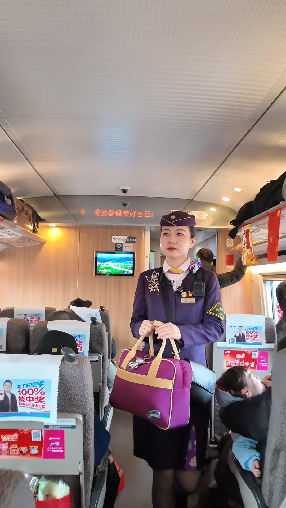 2月1日12:17,G7796次列车从南京南站驶出,载着满车的归乡人奔向远方。车厢连接处,南京客运段高铁三车队紫金号列车长杨慧霞正弯腰帮一位老人摆放行李。经过餐车旁的乘务室时,她的目光扫过台子上的一个紫色手拎袋——那是她的乘务包。略显鼓囊的袋子里,装的不是文件,而是她十多年春运路上积攒的“宝贝”。