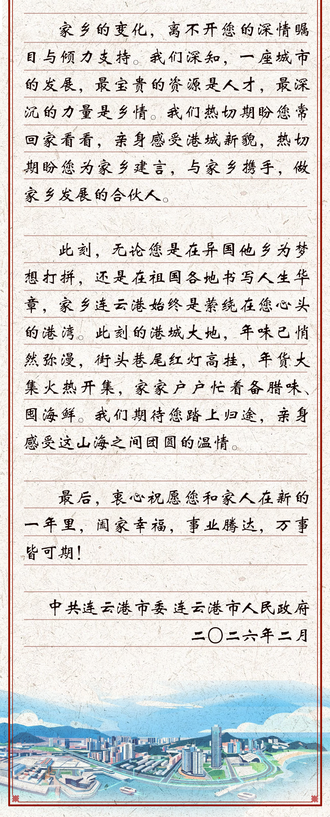 交汇点讯 一纸家书寄相思,万里山海盼君归。2月9日,连云港市委、市政府通过“连云港发布”微信公众号,向海内外连云港籍游子发出《山海寄相思 最暖是归途——致连云港籍在外的您》的家书。