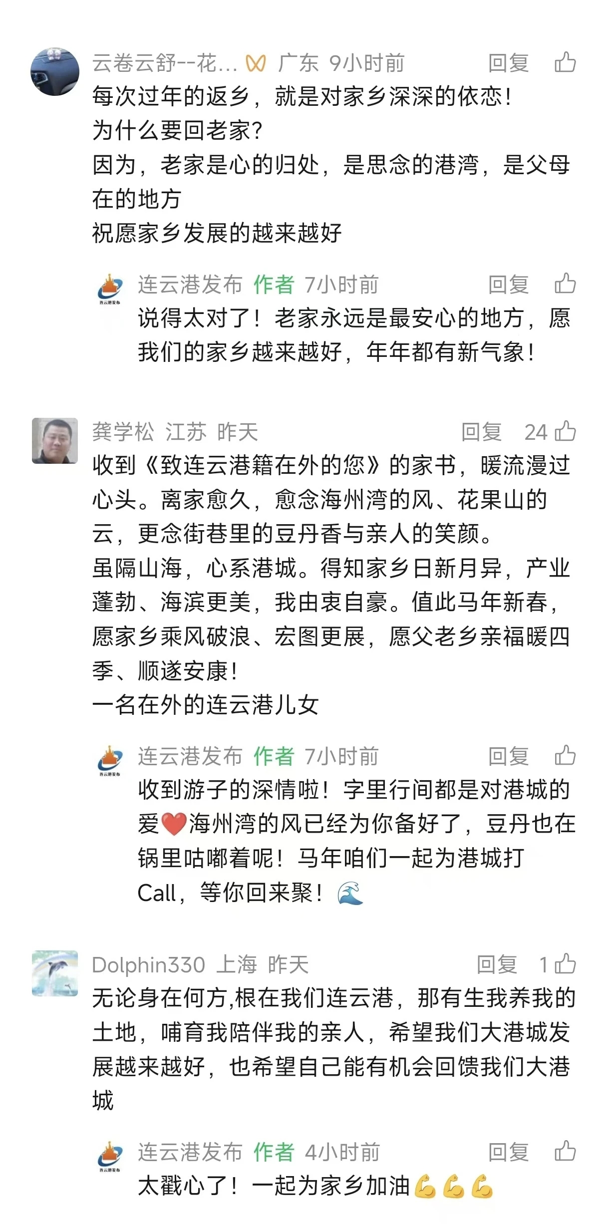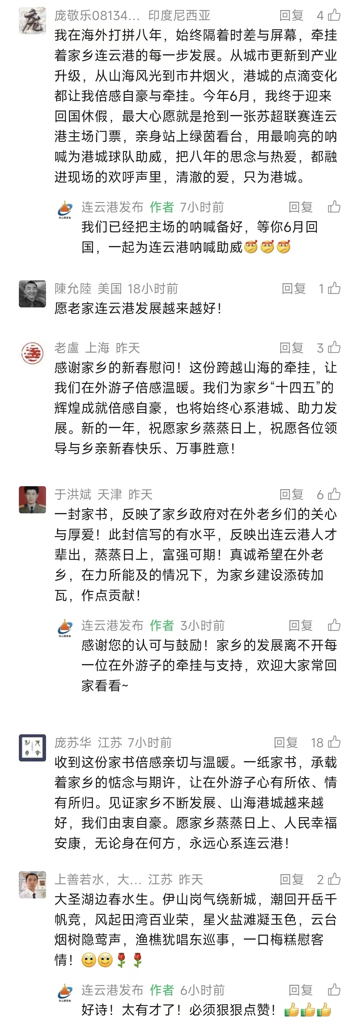 发展答卷,振奋人心,港城儿女为家乡成就自豪点赞。这封家书不仅是温情的呼唤,更是一份亮眼的城市发展成绩单。家书里细数了连云港“十四五”期间在产业勃发、城市更新、港口兴盛、山海旅游等方面取得的奋进成果,让在外游子倍感骄傲与自豪。“在海外打拼八年,始终牵挂着家乡的每一步发展,港城的点滴变化都让我倍感自豪与牵挂”“为家乡十四五的辉煌成就倍感自豪,也将始终心系港城、助力发展”,网友的留言道出了众多港城儿女的心声。从黄海之滨的港口崛起,到花果山旁的城市焕新,家乡的日新月异,成为游子心中最坚实的底气,也让更多人愿意心系桑梓、助力家乡发展。